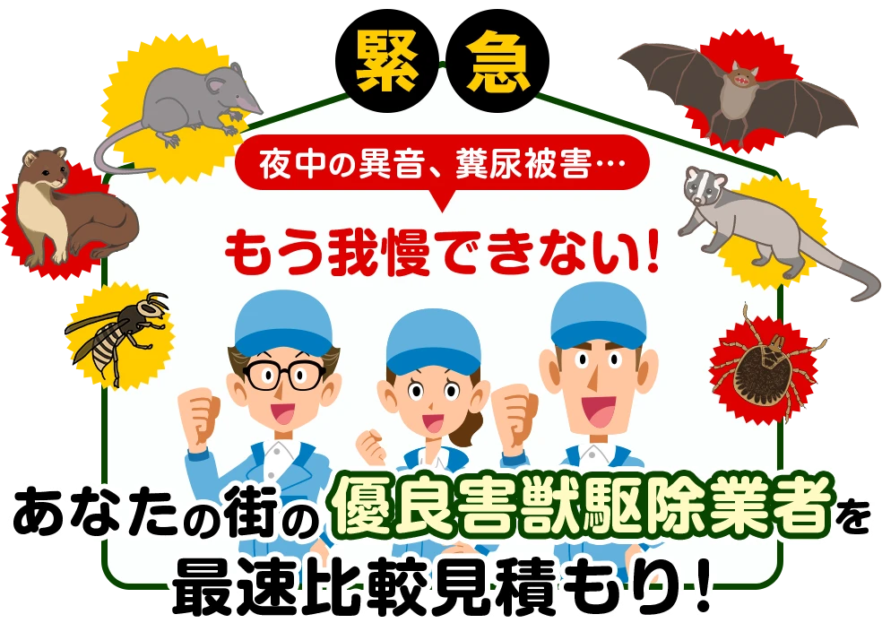 当サイトでは、厳選した信頼ある駆除業者の中から状況に合った業者を一括見積でご提案します。